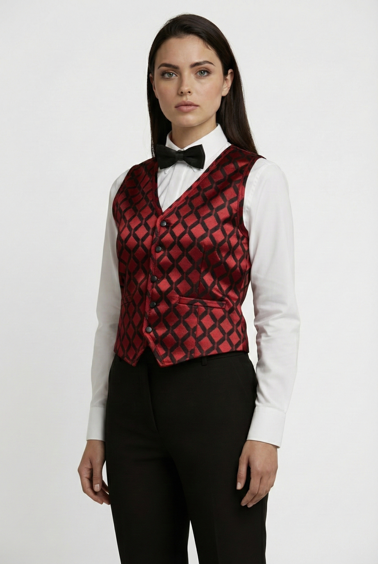 Este chaleco premium está diseñado para destacar en ambientes de hospitalidad, bares, casinos y centros de entretenimiento, donde la imagen del personal debe proyectar elegancia, brillo y profesionalismo. Su diseño de corte entallado realza la figura, mientras que el patrón geométrico aporta un toque sofisticado con presencia visual bajo luces ambientales.