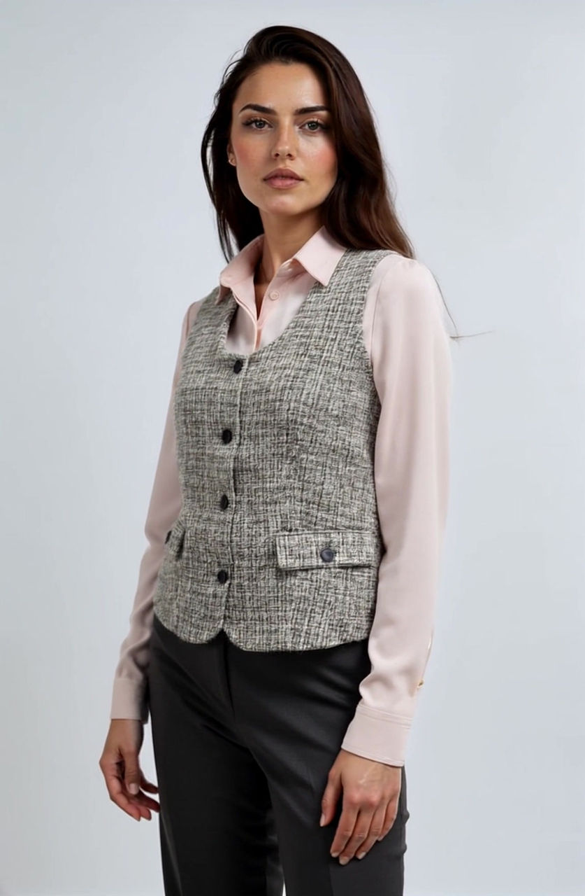 El chaleco de tweed en tonos neutros presenta un diseño entallado con botones frontales y bolsillos con solapa, acentuando la silueta y ofreciendo una imagen refinada y moderna.