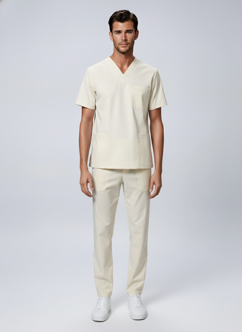 Uniforme médico masculino de corte clásico con un toque moderno, ideal para profesionales que buscan una imagen pulcra y elegante. La filipina, en tono marfil suave, cuenta con cuello en “V” y corte recto que proporciona comodidad y libertad de movimiento. Su diseño incorpora tres bolsillos funcionales (uno superior y dos inferiores) que ofrecen espacio suficiente para guardar instrumentos o accesorios clínicos.
