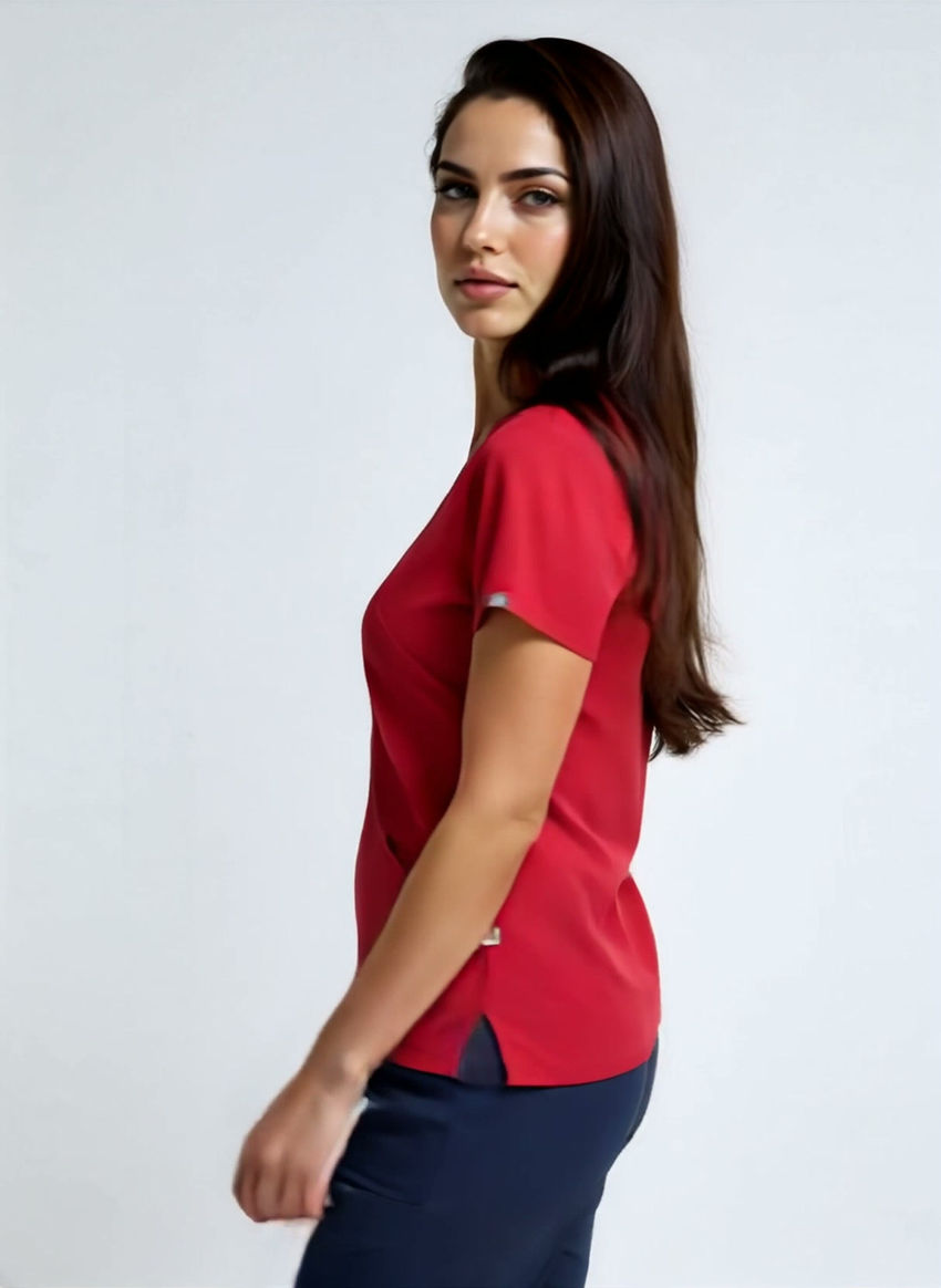 La filipina en color rojo carmín tiene un corte semi-entallado, ideal para favorecer la figura manteniendo la libertad de movimiento. Su cuello en “V” suave, costuras anatómicas y tela flexible permiten realizar actividades dinámicas del día a día, como agacharse, cargar materiales o interactuar con niñas y niños. Cuenta con bolsillos frontales funcionales para guardar artículos de uso frecuente como llaves, plumones, identificaciones o pañuelos.