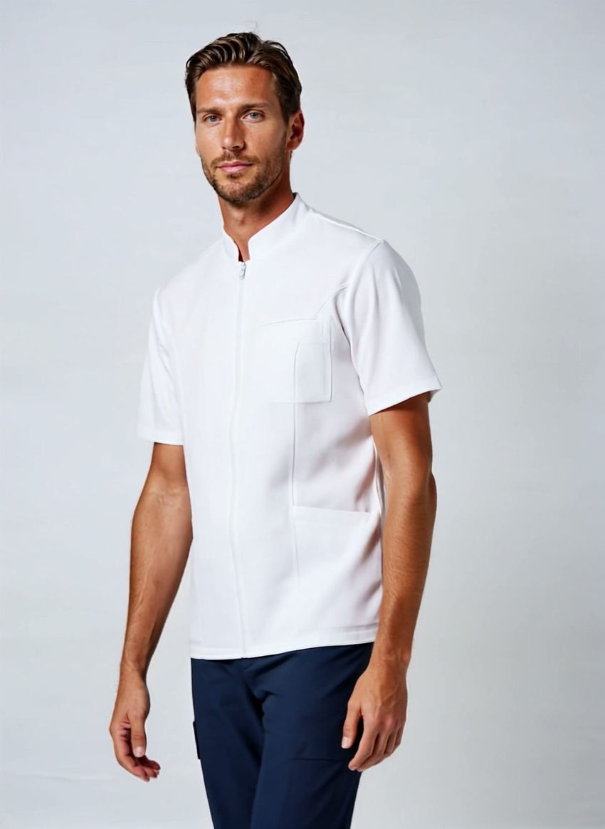 Filipina blanca de manga corta con cierre frontal oculto y cuello mao moderno, que proyecta limpieza y profesionalismo. Incluye bolsillos funcionales para portar herramientas de trabajo o accesorios esenciales.