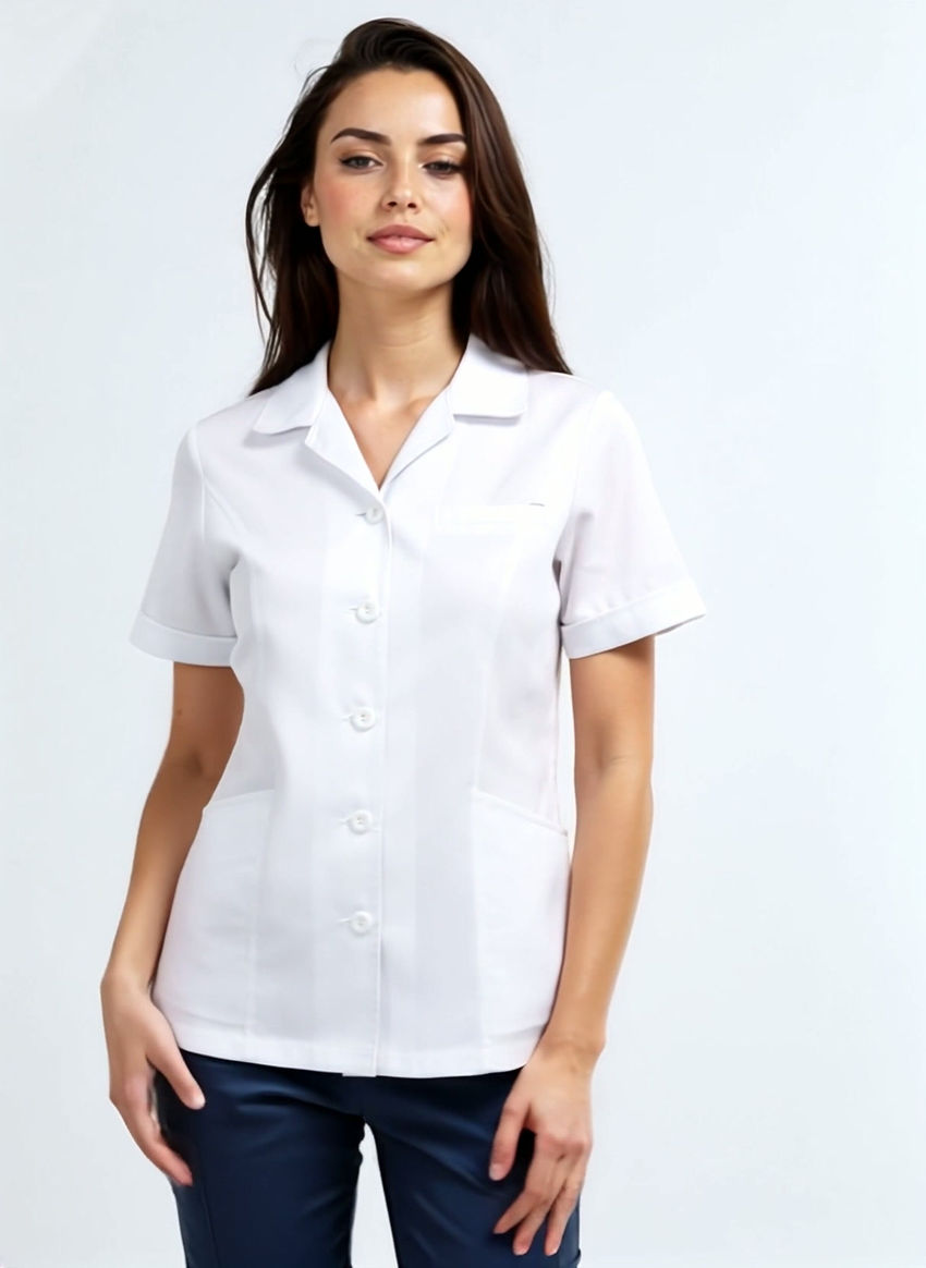 Este conjunto está diseñado para ofrecer una imagen pulcra, confiable y profesional dentro del sector hotelero. La filipina blanca tiene corte clásico con cuello tipo solapa y cierre de botones frontales, lo que brinda una presentación impecable ideal para áreas como recepción, housekeeping, spa o servicio al huésped. Cuenta con bolsillo superior y dos bolsillos laterales funcionales, perfectos para llevar accesorios de trabajo de forma discreta.