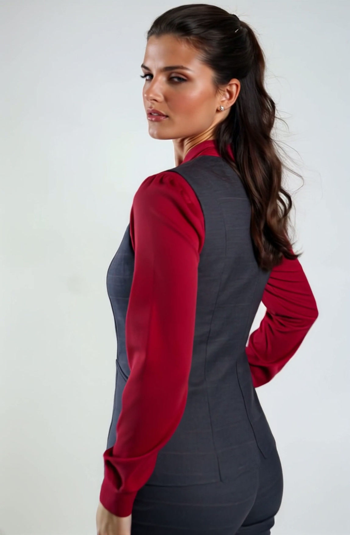 Este conjunto proyecta autoridad, sofisticación y energía profesional con un equilibrio perfecto entre estructura y modernidad. La combinación del tono vino intenso con el traje gris de cuadros finos ofrece una imagen elegante y poderosa, ideal para ejecutivas que buscan presencia y estilo.