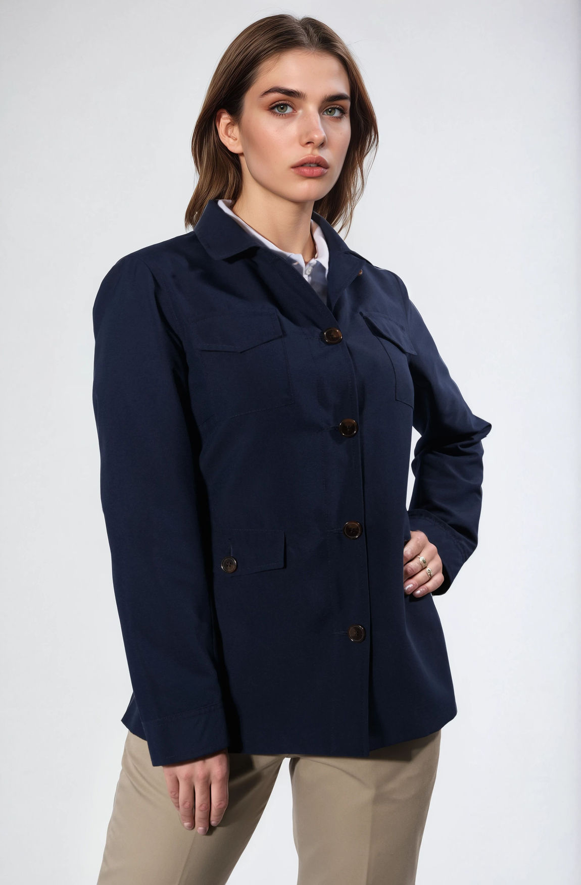 Detalles: Cuatro bolsillos funcionales con solapa y botones.