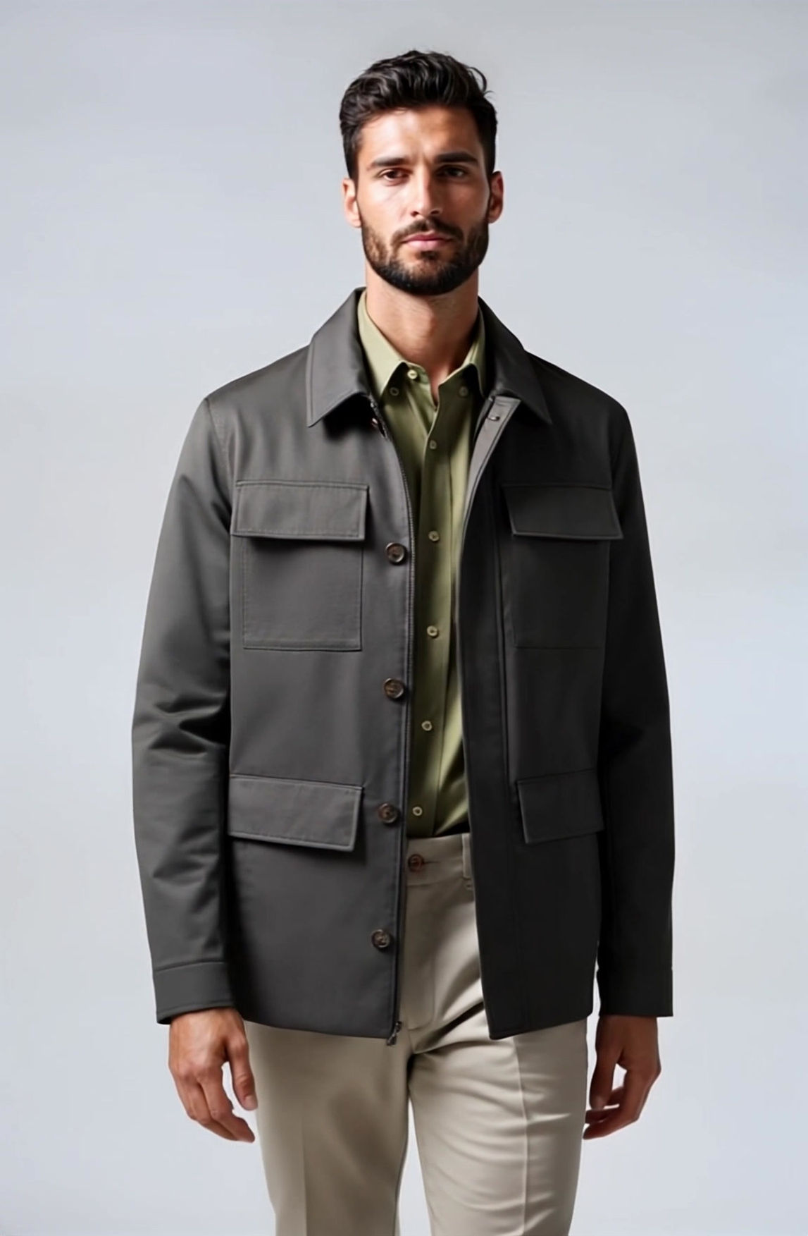 Este conjunto proyecta elegancia moderna y estilo casual ejecutivo. La cazadora verde destaca por su diseño estructurado con cuatro bolsillos frontales con tapa, cierre de cremallera y botones visibles que aportan un toque contemporáneo. Su confección con materiales resistentes la convierte en una prenda versátil, ideal tanto para entornos laborales como para uso urbano.