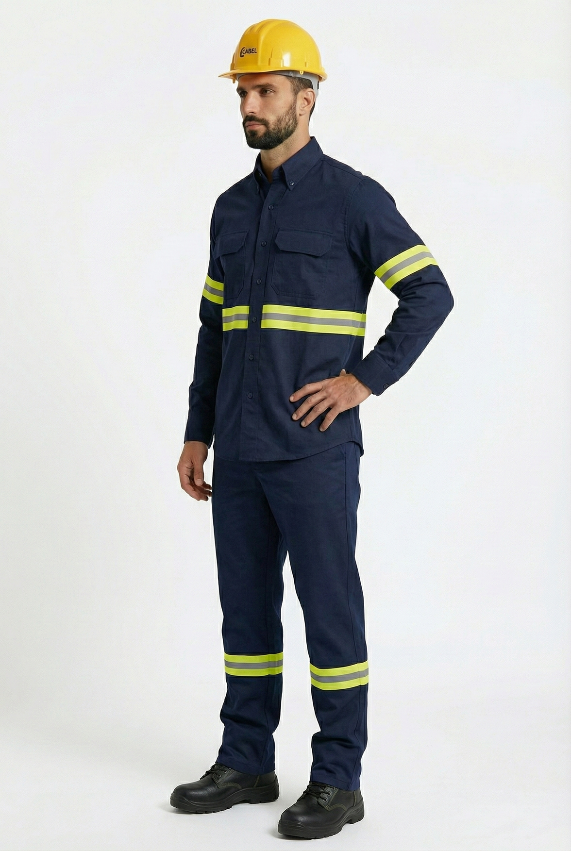 La camisa de manga larga cuenta con cuello tipo camisero, cierre frontal de botones reforzados y dos bolsillos superiores con solapa, ideales para resguardar herramientas o accesorios de trabajo. Las cintas reflejantes de alta visibilidad, ubicadas estratégicamente en pecho, mangas y piernas, incrementan la seguridad del usuario en ambientes de poca iluminación o zonas de alto riesgo operativo.