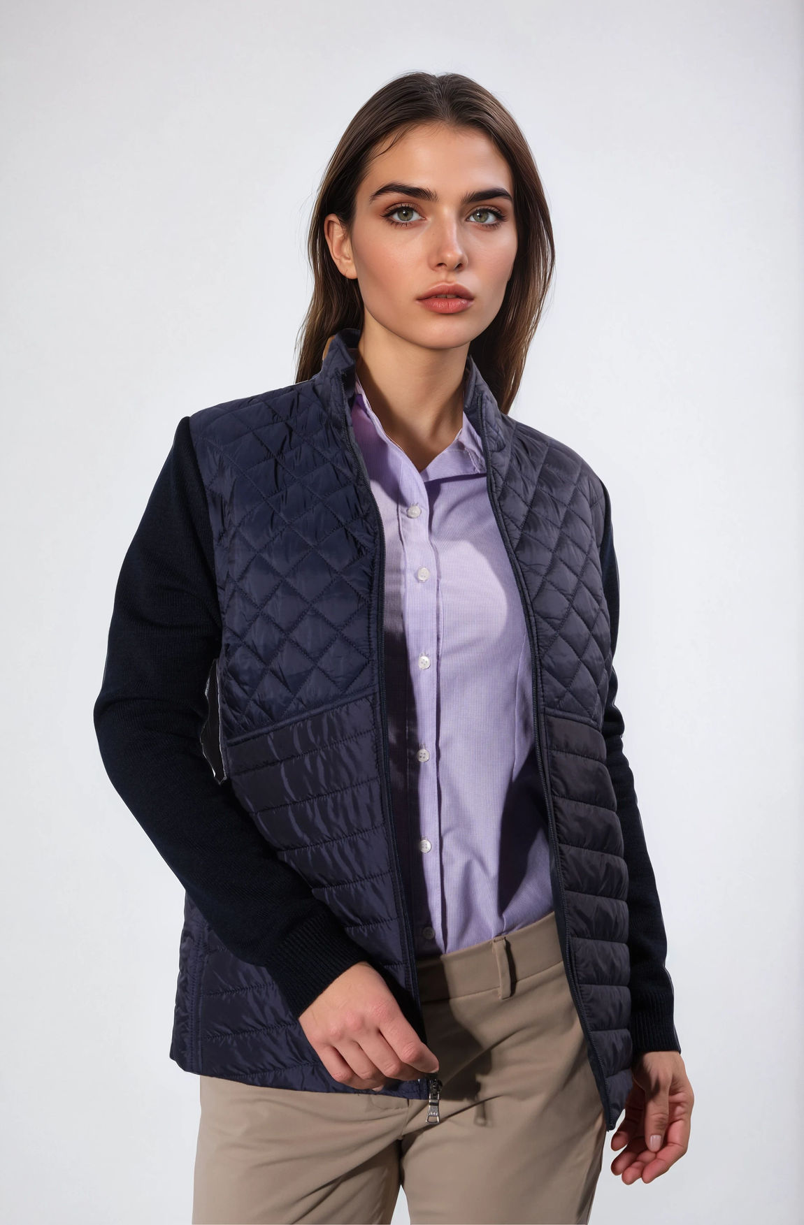 Con un cierre frontal completo y cuello alto, este modelo ofrece un estilo contemporáneo que puede usarse solo o como capa intermedia debajo de un abrigo o chaleco.