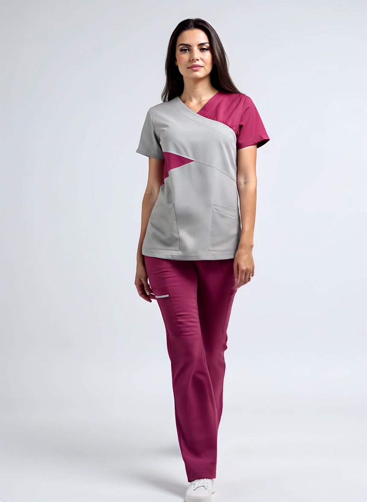 Con estilo innovador, este uniforme médico para mujer ofrece diseño y funcionalidad. La filipina clínica en gris con detalles vino burdeos cuenta con cuello cruzado en “V”, bolsillos prácticos y ajuste cómodo. El pantalón tipo cargo asegura libertad de movimiento y utilidad en el día a día. Ideal para enfermeras, doctoras y personal de salud que buscan profesionalismo y confort.