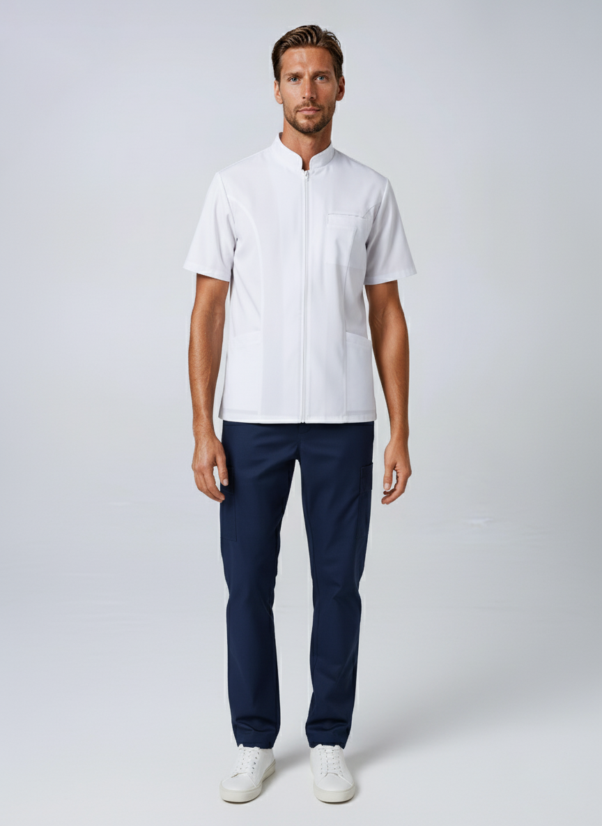 Filipina blanca de manga corta con cierre frontal oculto y cuello mao moderno, que proyecta limpieza y profesionalismo. Incluye bolsillos funcionales para portar herramientas de trabajo o accesorios esenciales.