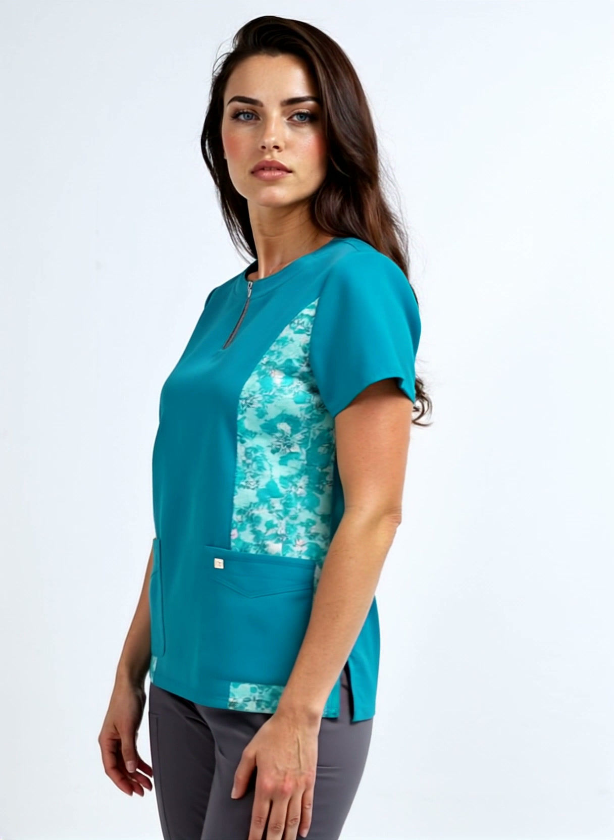 Color turquesa con paneles laterales estampados en tonos suaves tipo acuarela que aportan un toque relajante.