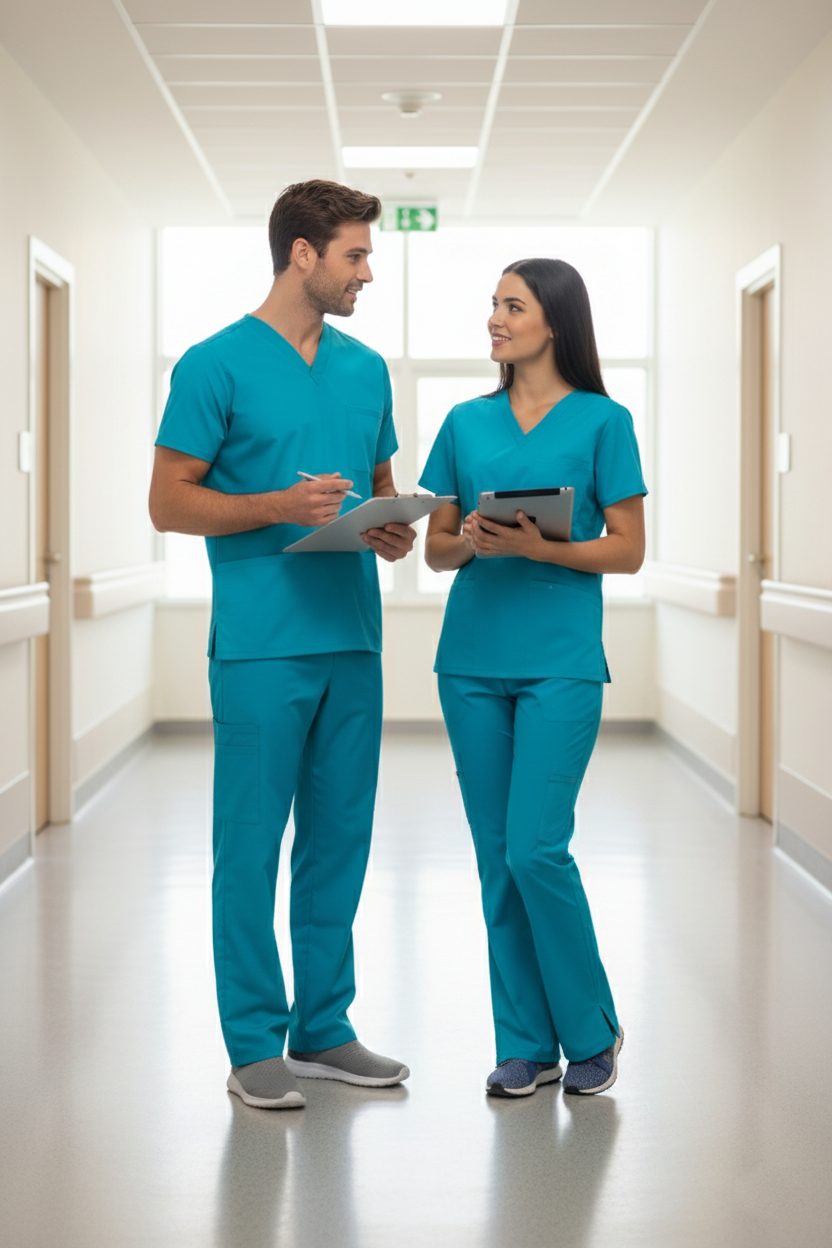 Refrescante, funcional y moderno, este uniforme médico en tono turquesa vibrante transmite energía y confianza en el entorno clínico. Su confección en tela spandex antifluido combina elasticidad, suavidad y protección, ideal para largas jornadas de trabajo.